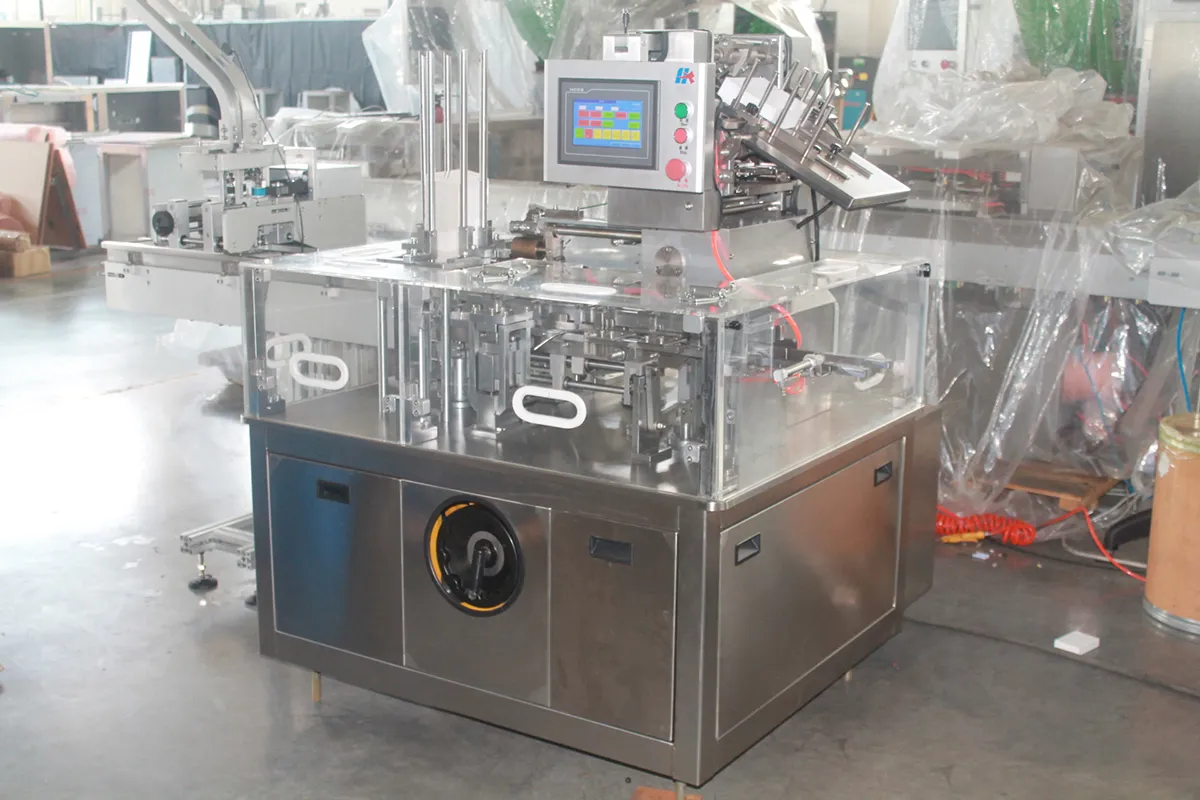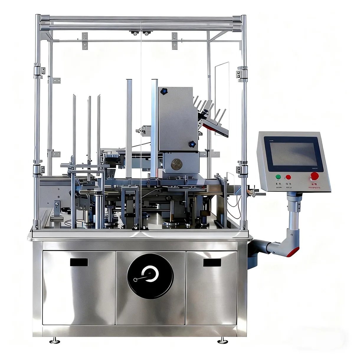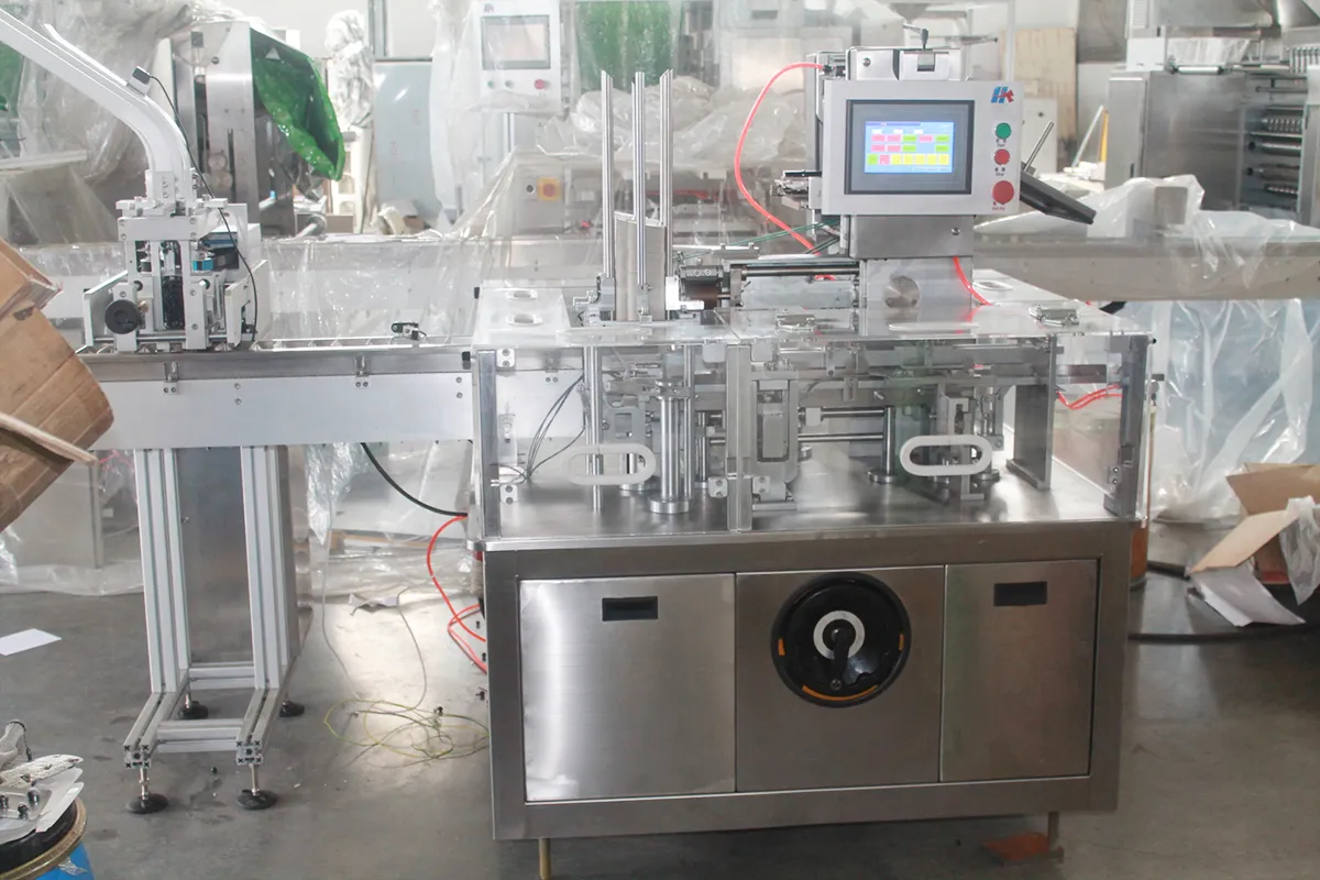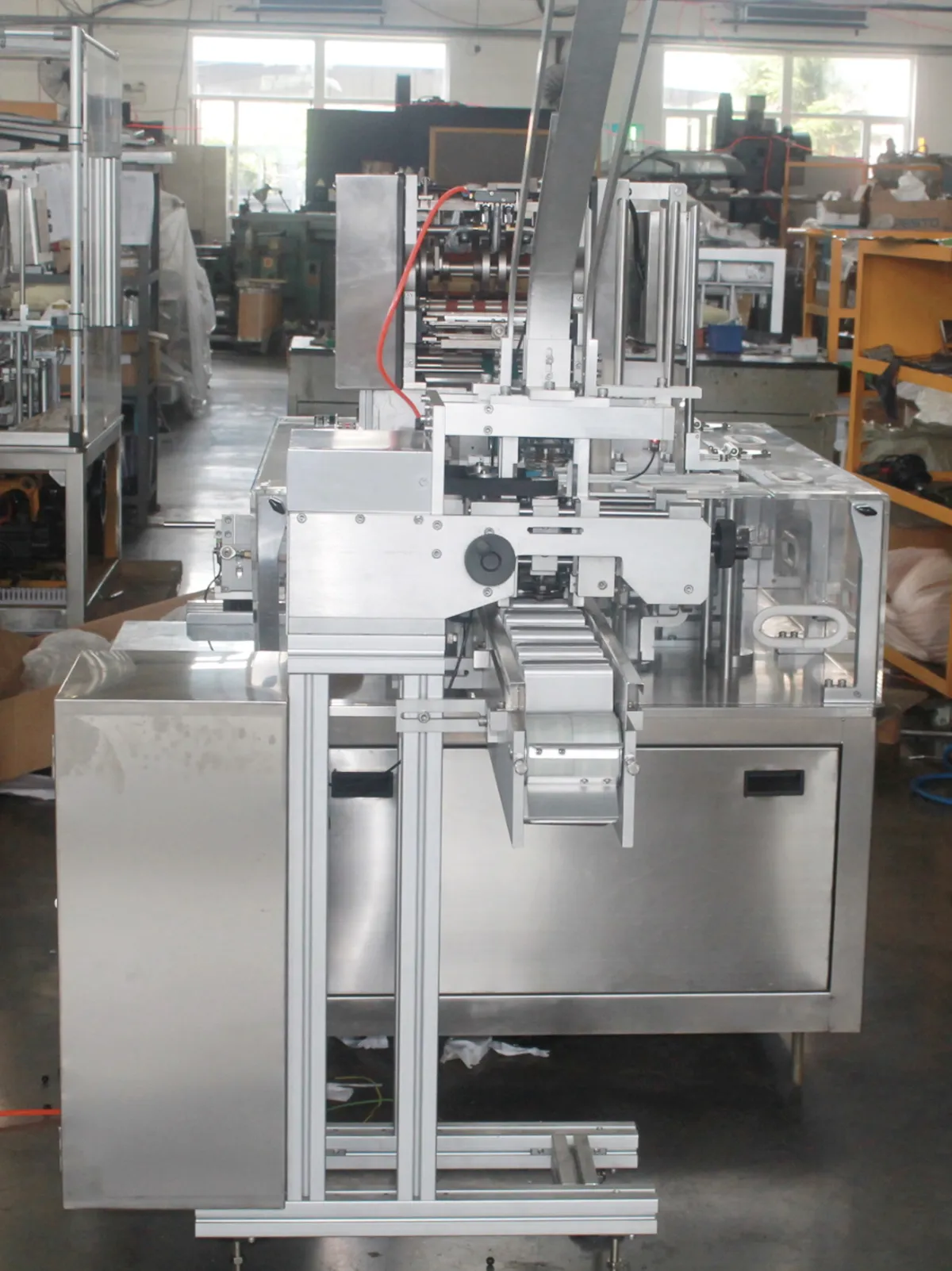 Оборудование представляет собой вертикальный картонажный автомат прерывистого действия. Он последовательно выполняет подачу продукта, транспортировку материалов, фальцовку инструкции, вложение инструкции, раскрытие коробки, укладку продукта и запечатывание коробки. Весь процесс картонирования полностью закрыт.